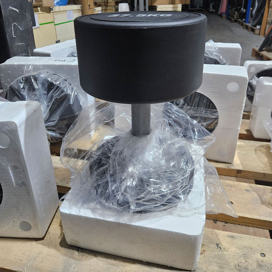DHZ Gummi Kurzhantelsatz von 2,5 bis 20kg in 2,5kg Stufen ( 8 Paare ) Farbe Schwarz, optional mit Ständer, gebraucht mit optischen Gebrauchsspuren