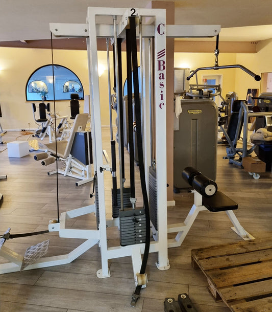 Competition Line 4 Stationenturm, 4 Stack Multi Station, Rudern, Latzug und 2 Seilzüge, Oldschool Bodybuilding, Rahmenfarbe Weiß, gebraucht - geprüfter Zustand mit Gebrauchsspuren
