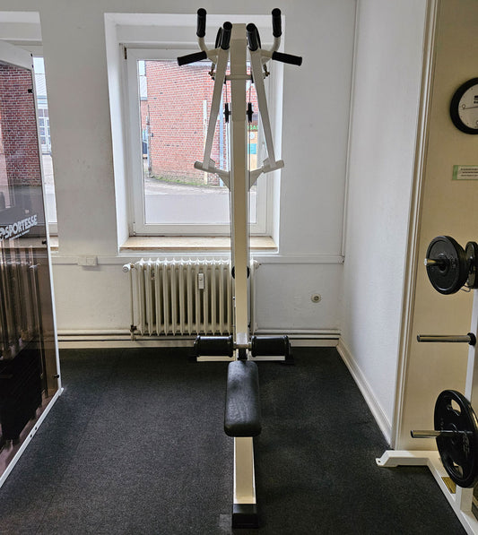 Latzug Bilateral, Pulldown, verschiedene Griffmöglichkeiten, Hersteller wahrscheinlich Künzler, Oldschool Bodybuilding Kraftgerät, Rahmenfarbe Weiß, gebraucht und geprüft mit Gebrauchsspuren