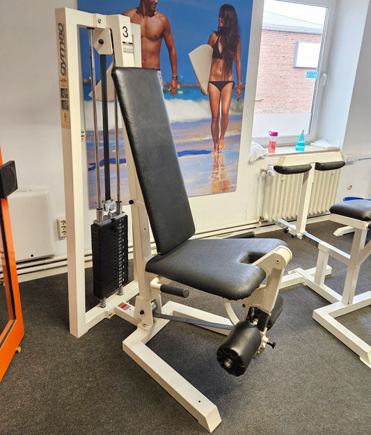 Gym80 Beinbeuger liegend, Leg Curl lying, Oldschool Bodybuilding Kraftgerät - Edition oder Classic Line, Rahmenfarbe Weiß, gebraucht und geprüft mit Gebrauchsspuren