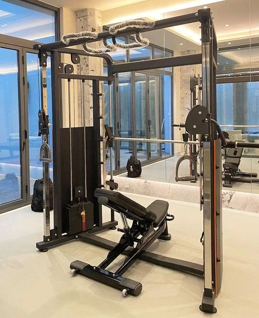 DankSport Enger Doppel Kabelzug höhenverstellbar und Multipresse geführt - 2 in 1 Kombigerät - Dual adjustable Cable Pulley and Smith Machine - 2x 100kg Gewichtsblöcke - Silber - NEU