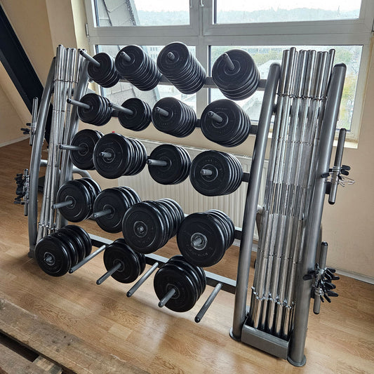 Elbesport Iron System Langhantelsets für Groupfitness, Gruppentraining, Kurse etc, Ähnlich Hot Iron Sets, inkl. Ständer-Ablage in Silber, gebraucht - mit Gebrauchsspuren