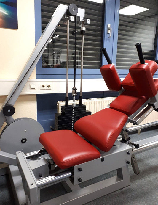 Einstellbare Beinpresse, SVG Reha Line Funktionsstemme, Rahmenfarbe: Silber-Grau, Polster: Braun, gebraucht - überholter Zustand
