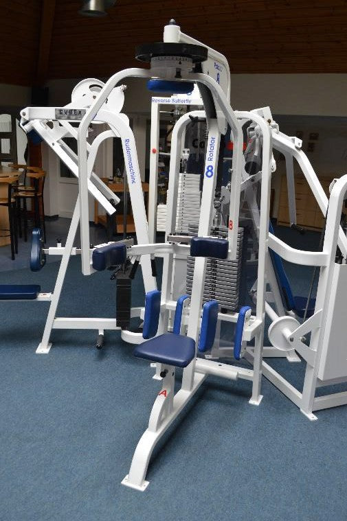 Gym80 Butterfly, Oldschool Bodybuilding Kraftgerät, Rahmen Weiß, gebraucht mit Gebrauchsspuren