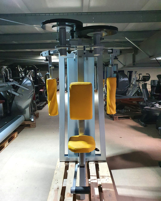 SVG Schulterblattfixator / Stützstemme - Latzug und Dips - Kombigerät 2 in 1, Rahmenfarbe Grau, Polsterfarbe Gelb, gebraucht - überholter Zustand