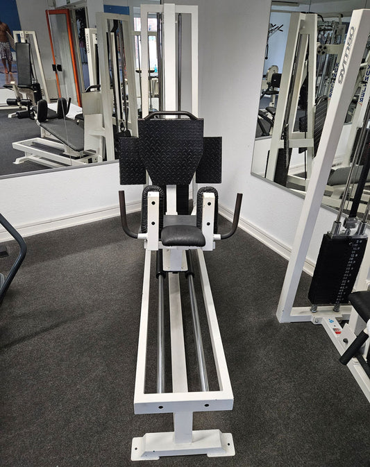 Beinpresse Oldschool, Leg Press, 225kg Gewichtsblock, Hersteller wahrscheinlich Gym80 oder L+K oder Galaxy, Bodybuilding Kraftgerät - Rahmenfarbe Weiß, gebraucht mit Gebrauchsspuren