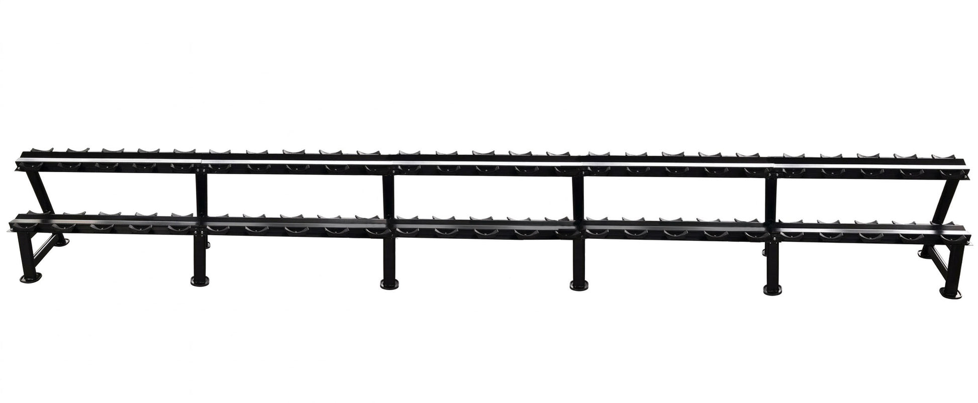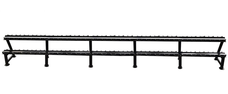 Dieses Hantelrack von DankSport eignet sich perfekt um Ordnung in das Fitnessstudio zu bringen. Ausgestattet mit 2 Reihen bietet es platz für 50 einzelne Hanteln also 25 Hantelpaare. Dank der Ablageschalen hat jede Hanteln einen festen Ort und kann nicht zu den Seiten wegrollen. Durch die gekannten Winkel in den horizontalen Stahlprofilen sind diese besonders stabil um auch große Lasten aufnehmen zu können. Die aufrechten Füße mit jeweils 2 Querprofilen leiten die Lasten über 2 große Standplatten in den Boden ab, diese sind zudem mit Gummischutz ausgestattet.