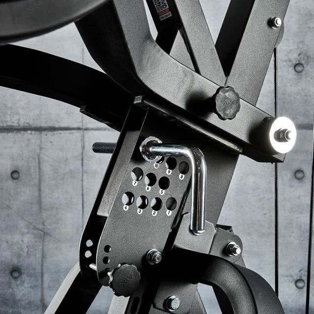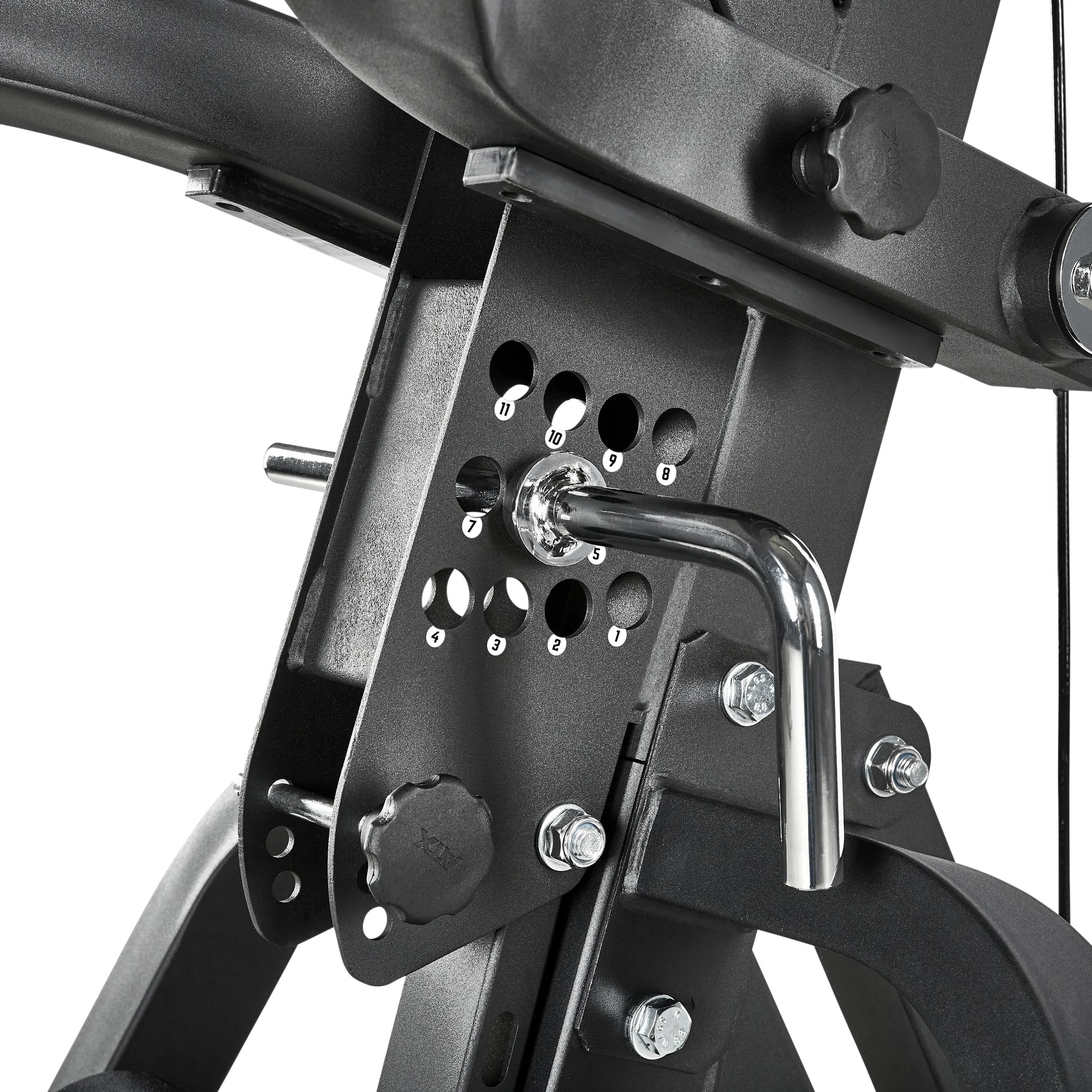 - Alternating lever arms with 2 handle variants, 11-way height adjustable in fine 50 mm increments and therefore optimally positioned for every exercise.