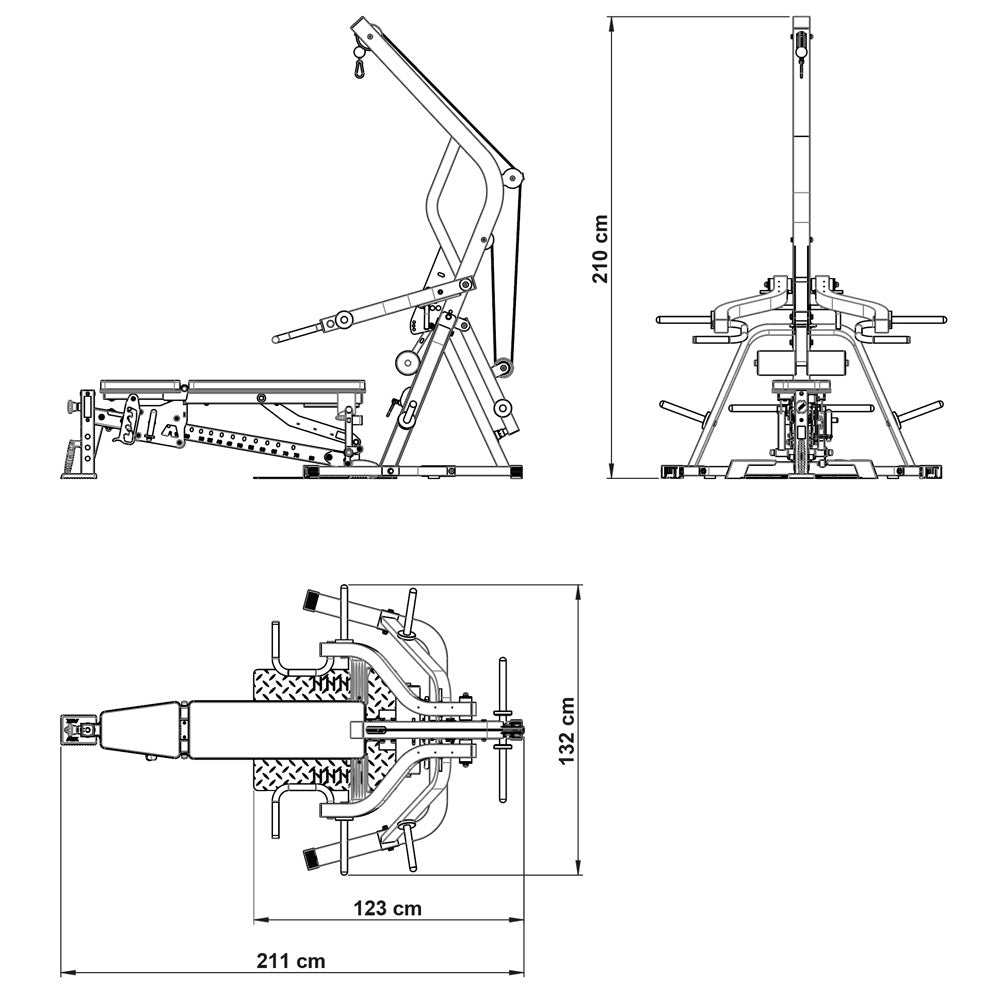 - Massive load capacity - multi-bench up to 400 kg, lever arms up to 250 kg, lat pulldown up to 160 kg