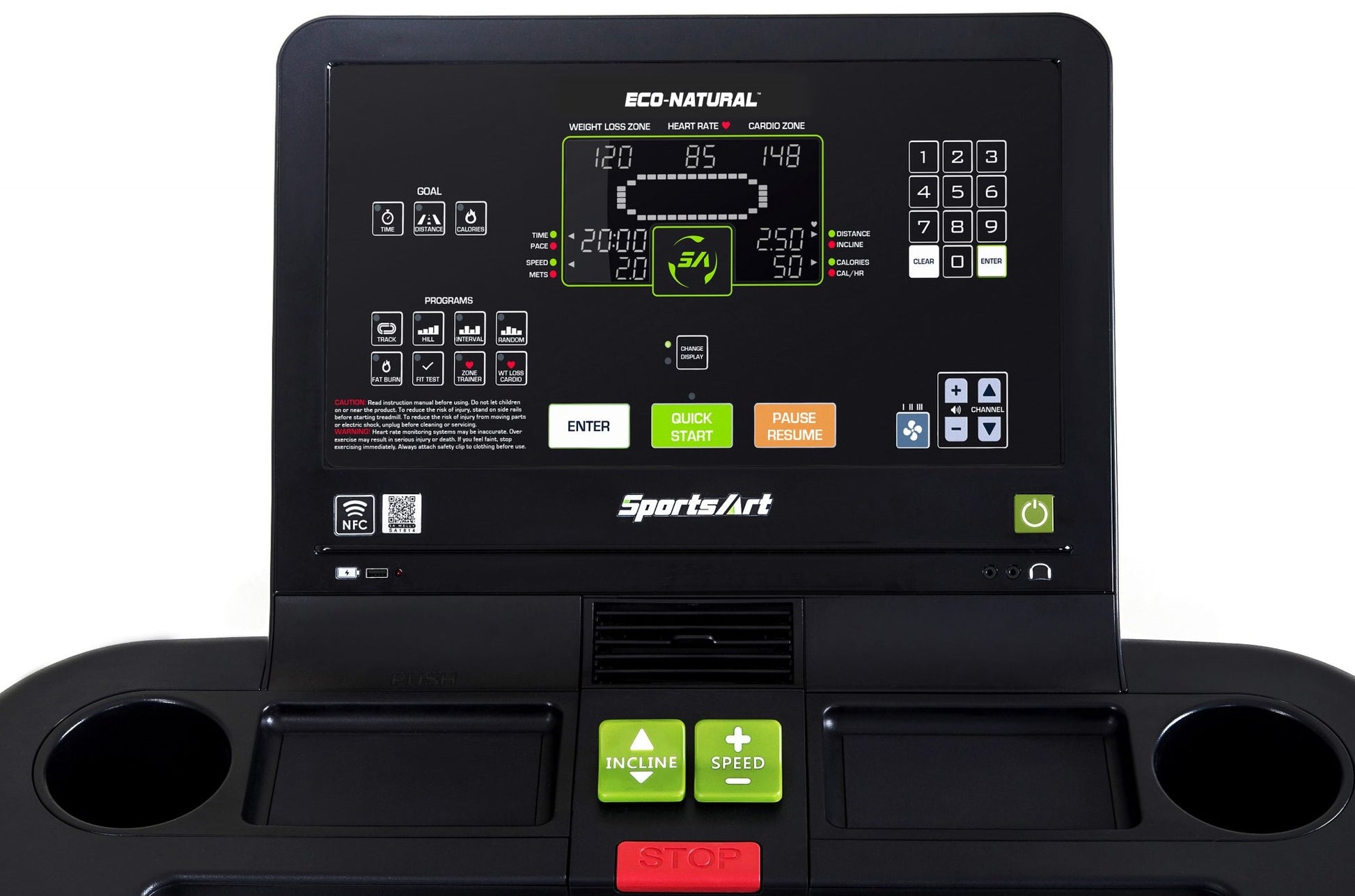 Die ECO-NATURAL-Linie von SportsArt ist die Verkörperung von Design, Technologie, Nachhaltigkeit und kardiovaskulären Spitzenleistungen. Das schlanke Design und die hochwertige Ausstattung in Kombination mit einem hochmodernen Motor sorgen für ein ansprechendes und energiesparendes Training, bei dem sich der Benutzer wohlfühlen kann. Das T676 ist unser Top-Laufband mit einem Steigungsbereich von -3 bis 15 % und einem Geschwindigkeitsbereich von 0,15 bis 17 mph, der die Bedürfnisse jedes Benutzers erfüllt.