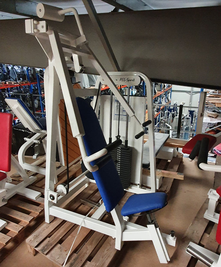 Mit dieser Schrägbankdrückmaschine von ASS können Sie isoliert und schonend die gesamte Brustmuskulatur aber vorallem den oberen Teil des Brustmuskels trainieren. Der Sitz ist in 10 Stufen höhenverstellbar, dadurch kann die Schrägbankdrückmaschine individuell an die Körpergröße angepasst werden. Es sind zwei verschiedene Griffvarianten für unterschiedliche Range of Motions angebracht. Das Trainingsgerät ist mit einem großen Steckgewichtsblock mit 100kg ausgestattet. Trotzdem kann in 5kg Stufen das Gewicht steigern.