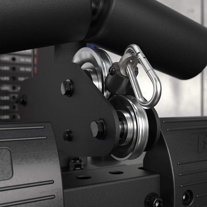 - Kugelgelagerte doppelläufige Seilrollen bei der unteren und oberen Seilaufhängung gewähren ein einwandfreies Abgleiten des Seiles und minimieren somit den Abrieb oder die Beschädigung des Zugseiles