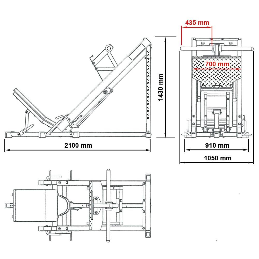 Die Start/Endarretierung ist einfach und intuitiv in der Bedienung, die Notablage ist individuell in der Höhe einstellbar. Die extra lange Hantelscheibenaufnahme gewährt viel Aufnahmekapazität und ist bis 500 kg belastbar. Integrierte Band-Pegs ermöglichen das Anbringen von Widerstandsbändern. Perfekt konzipiert, für schweres und effizientes Beinpressen.