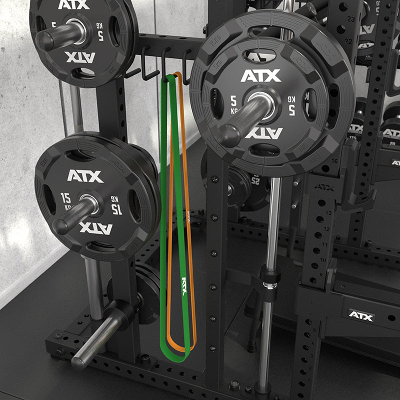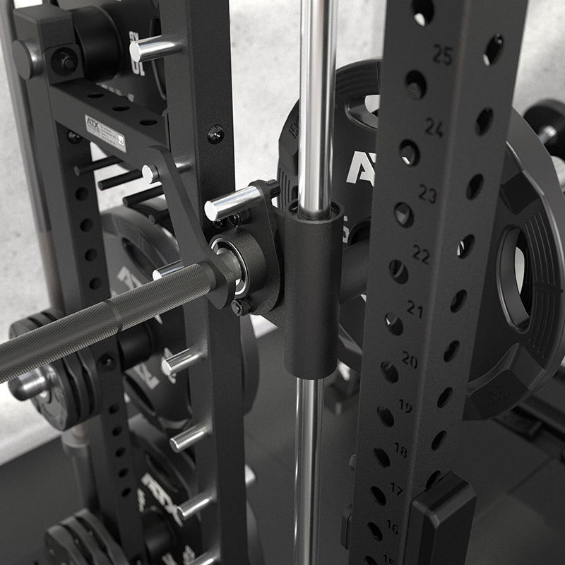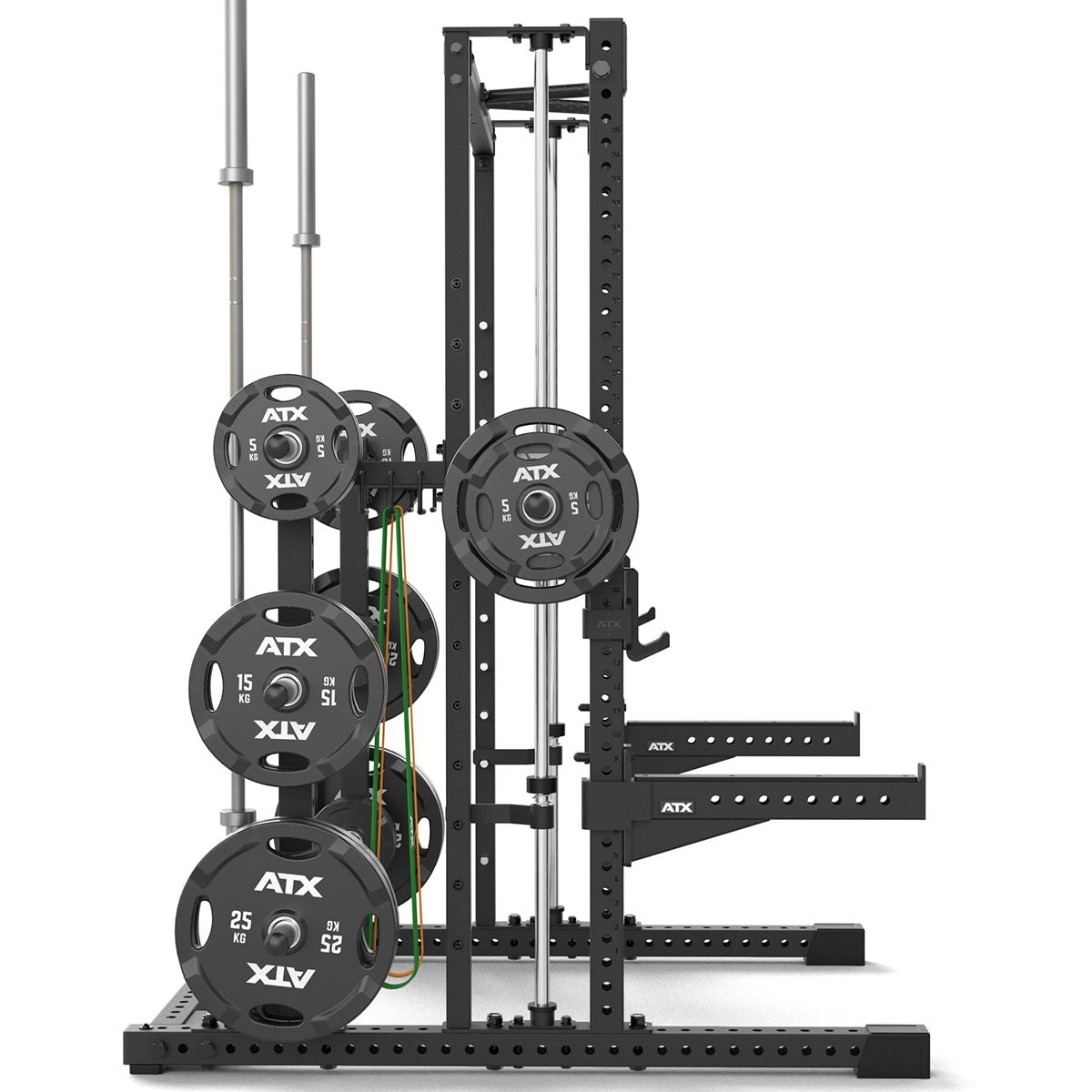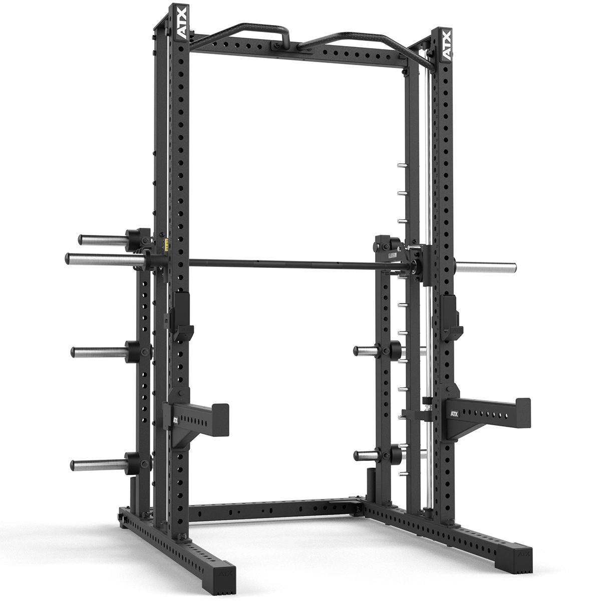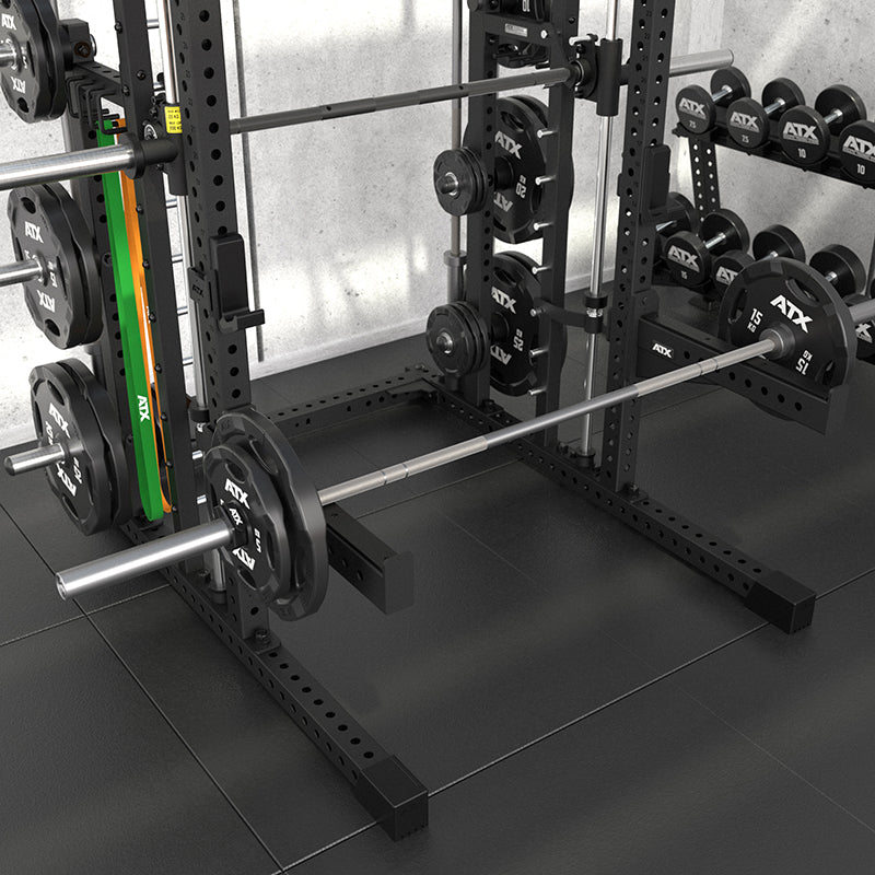 Alle relevanten Langhantelübungen können wahlweise frei am stabilen Half Rack oder präzise geführt an der seidenweich laufenden Multipresse ausgeführt werden.