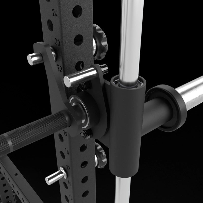 Die J-Hooks sind aus 10 mm starkem Vollstahl gefertigt. Die Schwerlast-Notablagen haben doppelte Arretierbolzen und sind somit extrem belastbar. Die Haken- und Notablagen sind innen und außen mit dicken Schutzbelägen versehen, die das Gerät und die Hantelstange vor Abrieb und Beschädigung schützen und die Geräuschentwicklung deutlich minimieren. Die Klimmzugstange ist griffig gerändelt und ermöglicht alle relevanten Griffpositionen. Die Logo-Platte mit aufgedrucktem ATX-Logo hat ein extra tiefes Spreizmaß und ist komplett aus Stahl gefertigt, dies garantiert höchste Kraftaufnahme und maximale Steifigkeit des Rahmens.