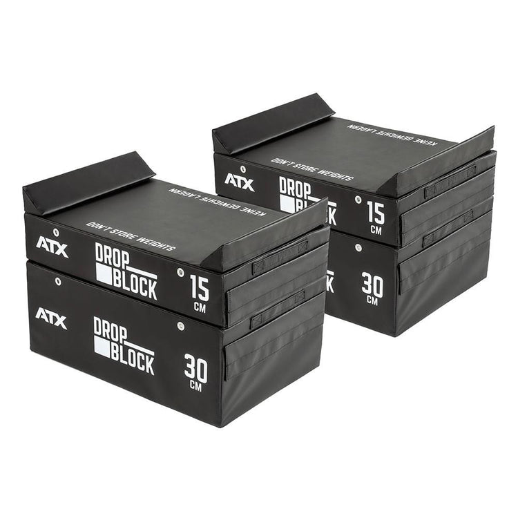 Das ATX Soft Drop Block-Set ist dabei die ideale Unterlage zum Schutz von Böden und Equipment. Mit den Soft-Drop-Blocks können Sie Ihre Hantel / Gewichte nun auch in akustisch sensiblen Bereichen / Räumlichkeiten ruhig mal aufprallen lassen. Die hochwertige Schaumstofffüllung hat geringe Rückpralleigenschaften und bietet eine hohe Schalldämpfung. Die Ummantelung ist sehr strapazierfähig und hat allseitig Entlüftungsdüsen, welche ein Aufplatzen der Ummantelung durch abrupten Aufprall verhindern. Durch die eingearbeiteten Klettstreifen lassen sich die Blocks sicher miteinander verbinden / stapeln. Die Anschlagkeile, welche ebenfalls über die Klettstreifen angebracht werden, verhindern ggf. ein Abrollen der Hantel.