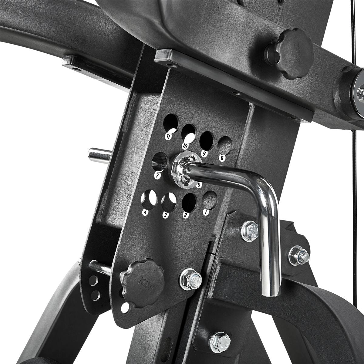 - Alternierende Hebelarme mit 2 Griffvarianten, 11-fach in feinem 50 mm Raster in der Höhe verstellbar und dadurch für jede Übung optimal positionierbar.