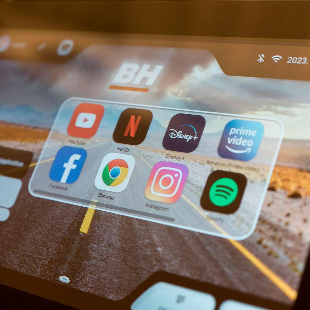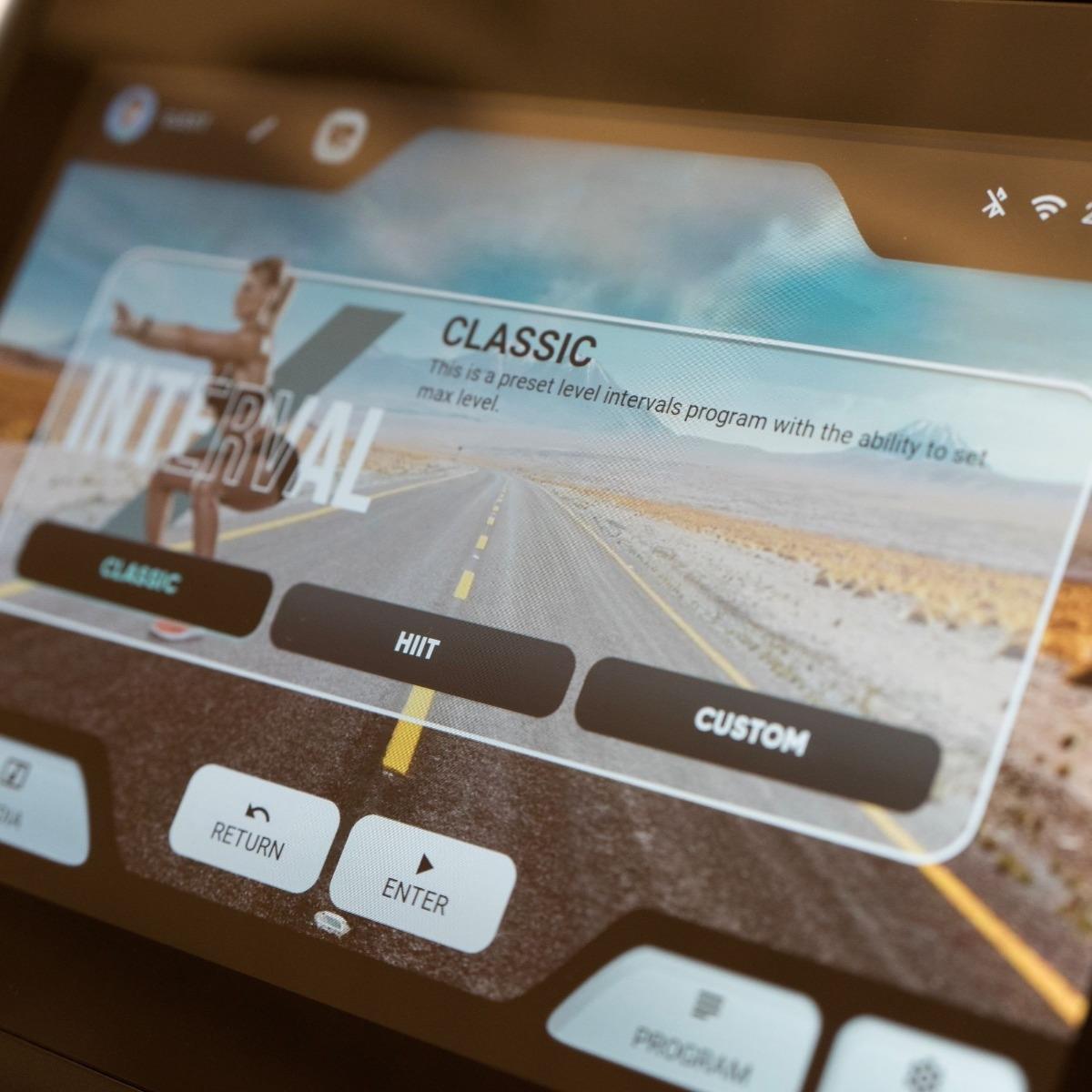 10" TFT-Monitor mit Touchscreen und 16 voreingestellten Trainingsmodi. Integrierte Apps (Netflix, Youtube, Disney+...) und Bildschirmspiegelung verfügbar. Möglichkeit zum Anschluss von Zusatzgeräten wie Pulsarmbändern oder Kopfhörern.