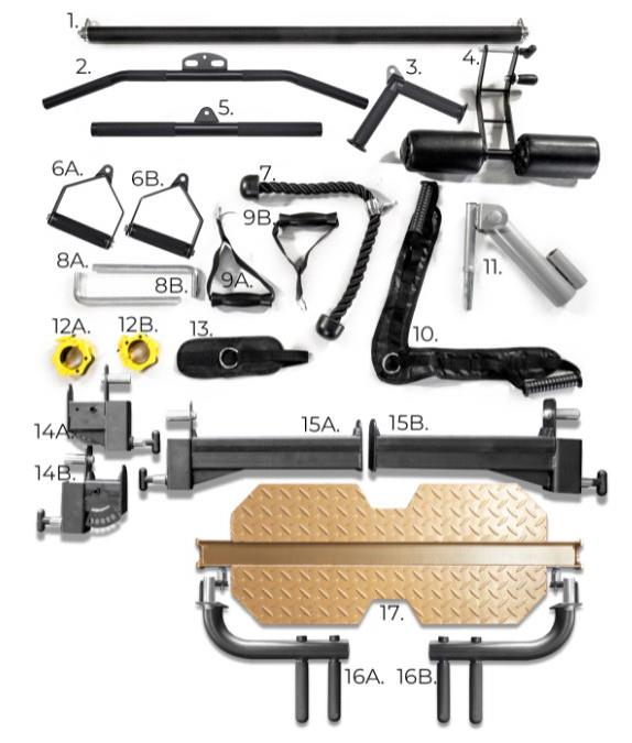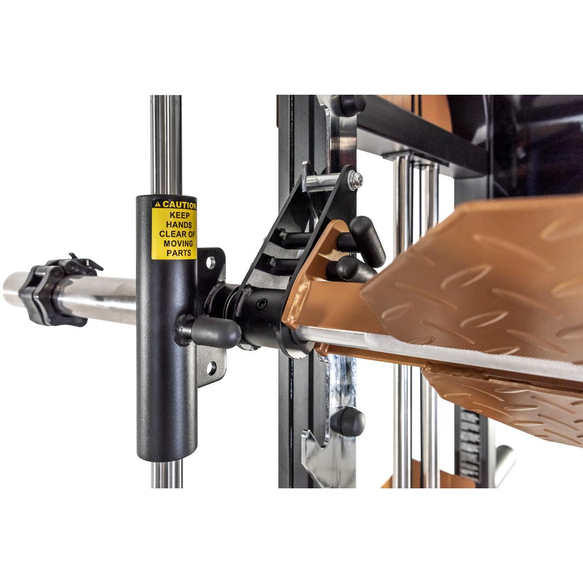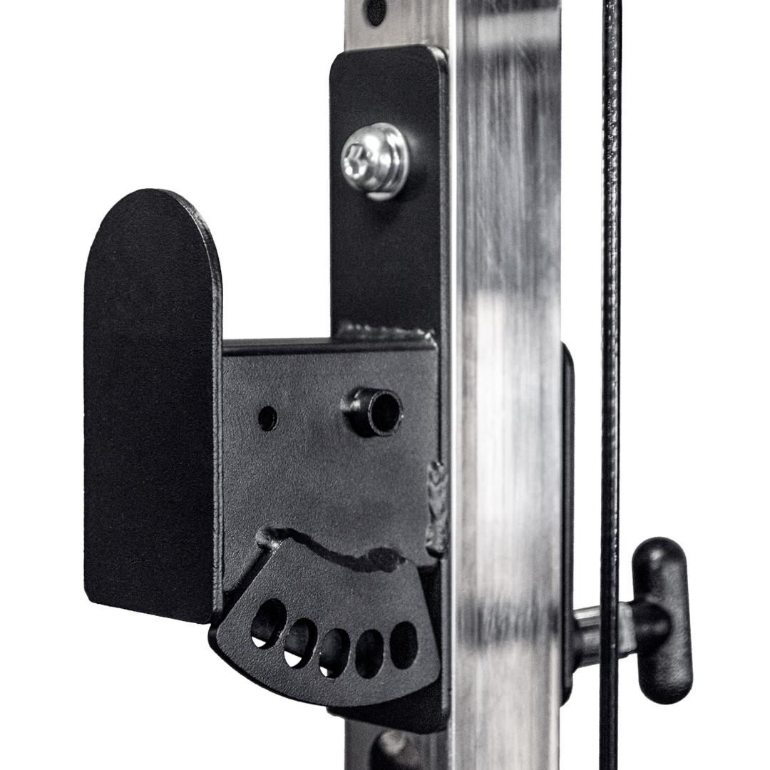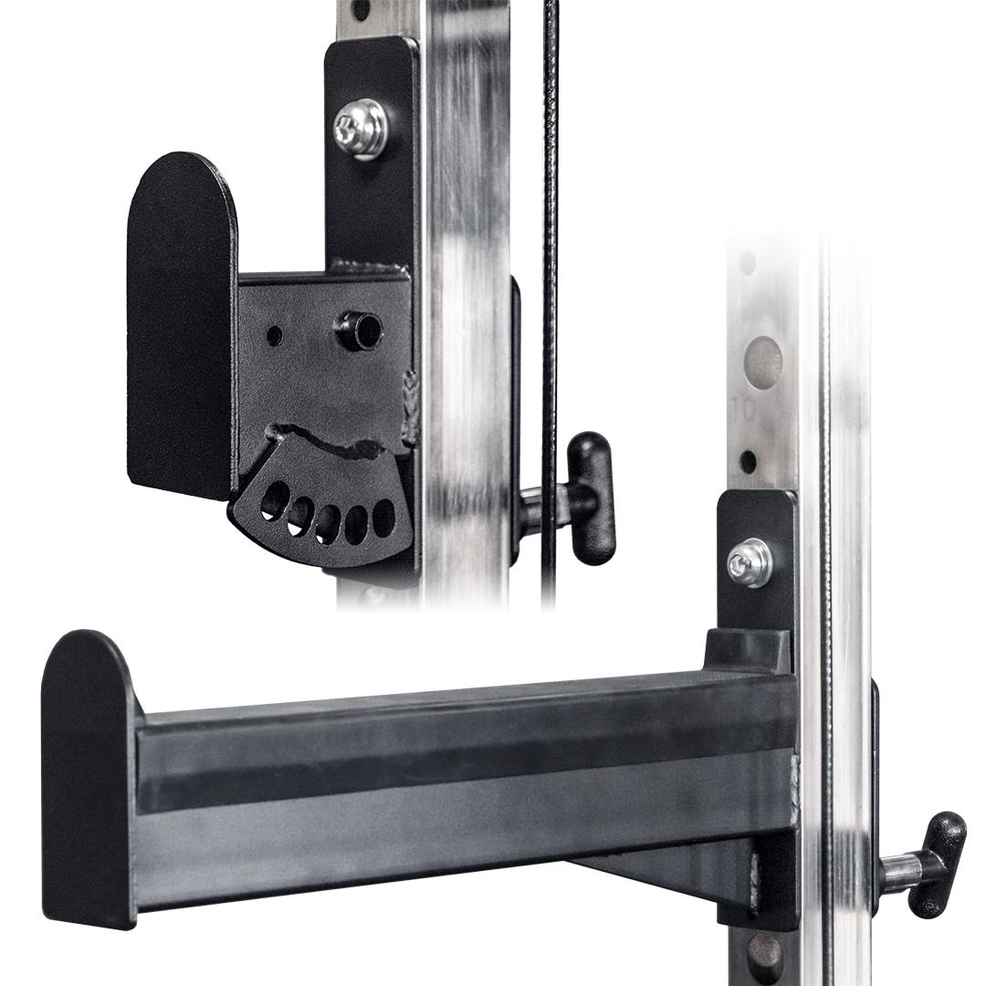 - Sowohl der J-Hook als auch die Spotter Arms sind mit Sicherheitsstiften und praktischen 8-mm-Streifen ausgestattet, um zu verhindern, dass die Hantel mit der Oberfläche der Struktur in Berührung kommt, was einen möglichen Abrieb verhindert.