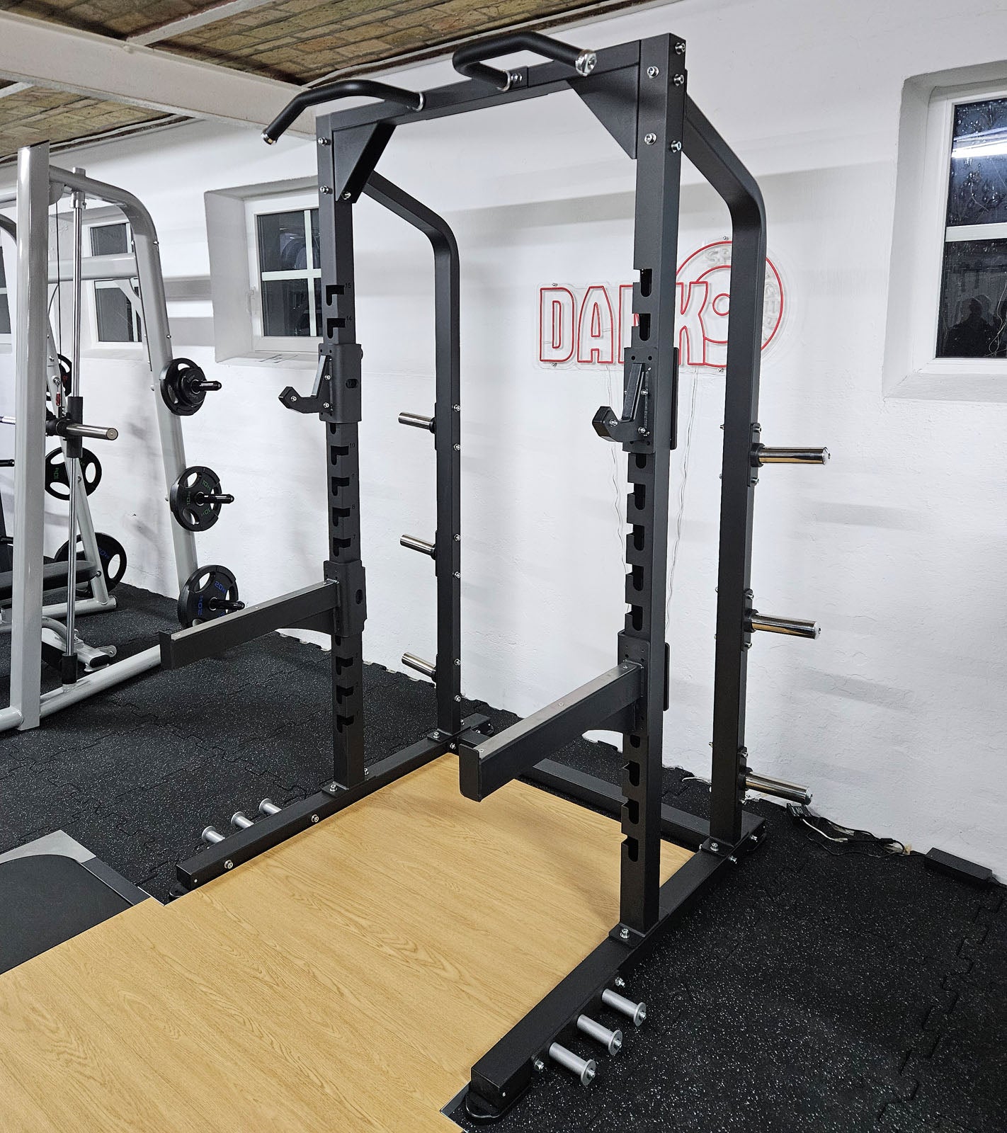 Half Rack mit Klimmzugmöglichkeit und verstellbaren Sicherheitsablagen und J-Hooks.