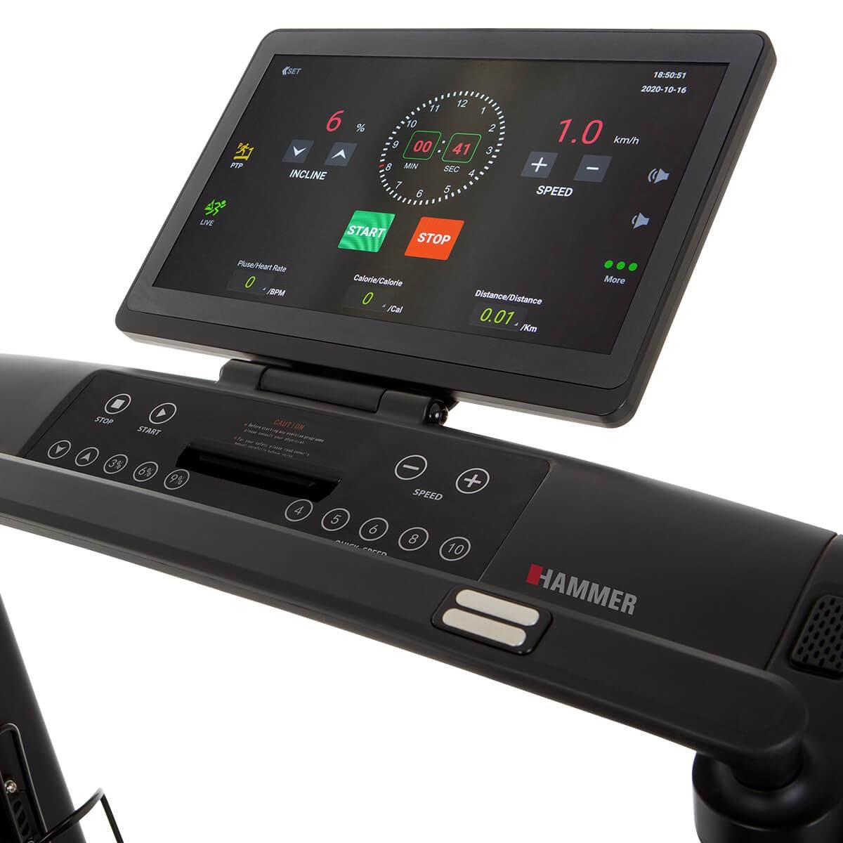 Du bleibst immer informiert und erhältst übersichtlich auf dem großen 15,6 Zoll Touch-Bildschirm Deine Trainingsdaten. Einfach, durch die Fingersteuerung/-berührung, werden Dir folgende Werte grafisch und farbig angezeigt: Distanz, Steigung, Kalorien, Puls, Trainingszeit, Geschwindigkeit, Zugang zu verschiedenen Apps, USB-Zugang, Einstellungen, Live Strecken und die große Programmauswahl.