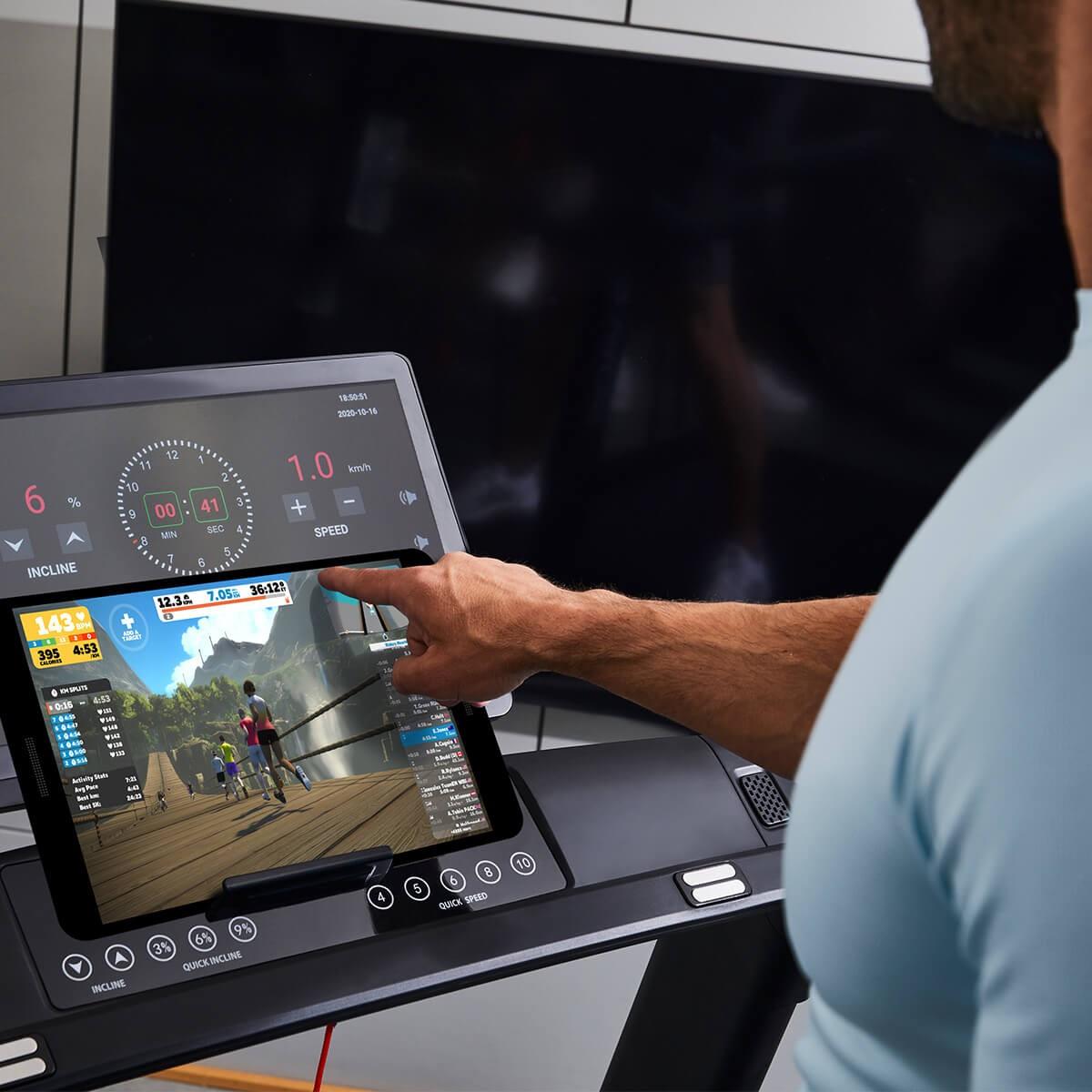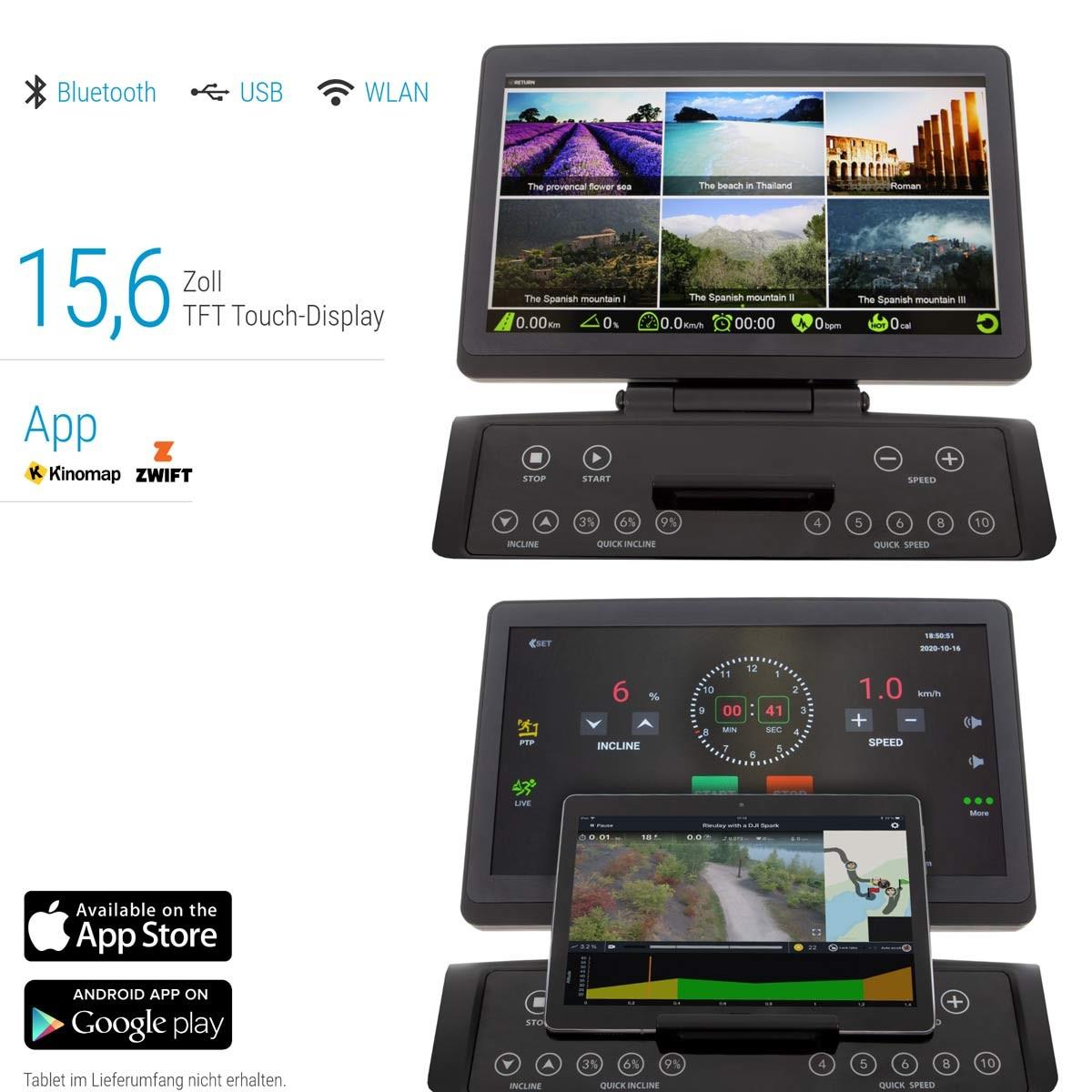Mit der Laufbandkonsole wird über die verschiedenen Schnellwahltasten Deine Laufgeschwindigkeit und Steigung gesteuert. Direkt an der Konsole bietet Dir eine Tablethalterung Platz für Dein mobiles Gerät. Mit den Computertasten hast Du sofortigen Zugriff auf alle wichtigen Trainingseinstellungen. Du regelst mit den einzelnen Tasten, u.a. den Trainingsstart/-stopp, die Steigung und die Geschwindigkeit. Der Bluetooth-fähige Computer wird schnell mit Deinem Tablet oder Smartphone verbunden und Musik oder vorinstallierte Apps (Netflix, Chrome, YouTube - ZWIFT und Kinomap kompatibel) können damit Dein Lauferlebnis steigern. Der Computer hat eine WLAN-Funktion für noch mehr Abwechslung! Für die Nutzung der verschiedenen Fitness-Apps und für den Internetzugang kannst Du das Laufband mit einem Hotspot oder Deinem Heimnetzwerk verbinden.
