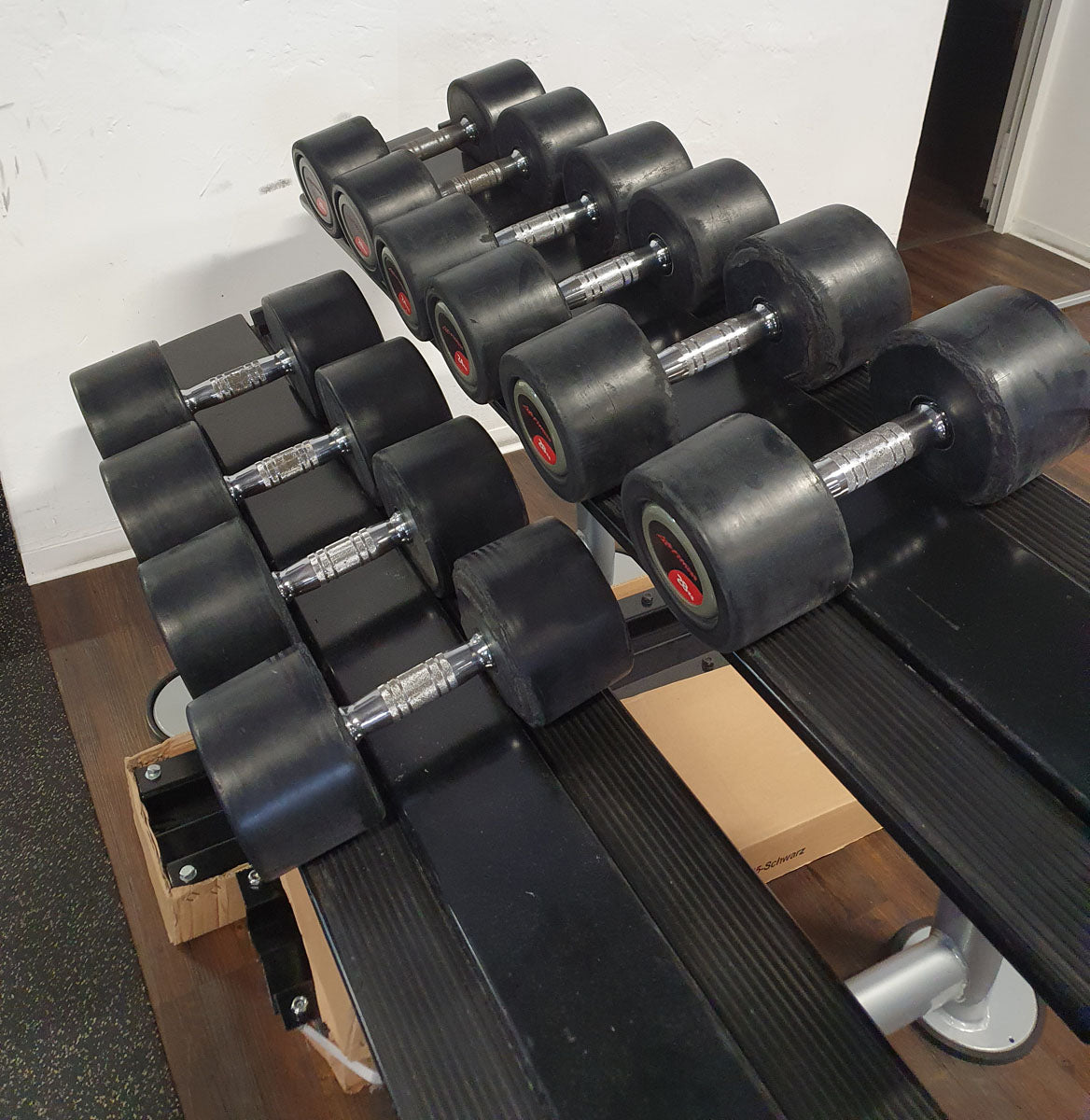Gebrauchter Kurzhantelsatz, rund und gummiert von 2kg bis 40kg von Life Fitness in 2kg und 2,5kg Stufen sowie ein paar anderen Hanteln da mal ein Teil des Life Fitness Satzes geklaut wurde und dann nachgekauft wurde.