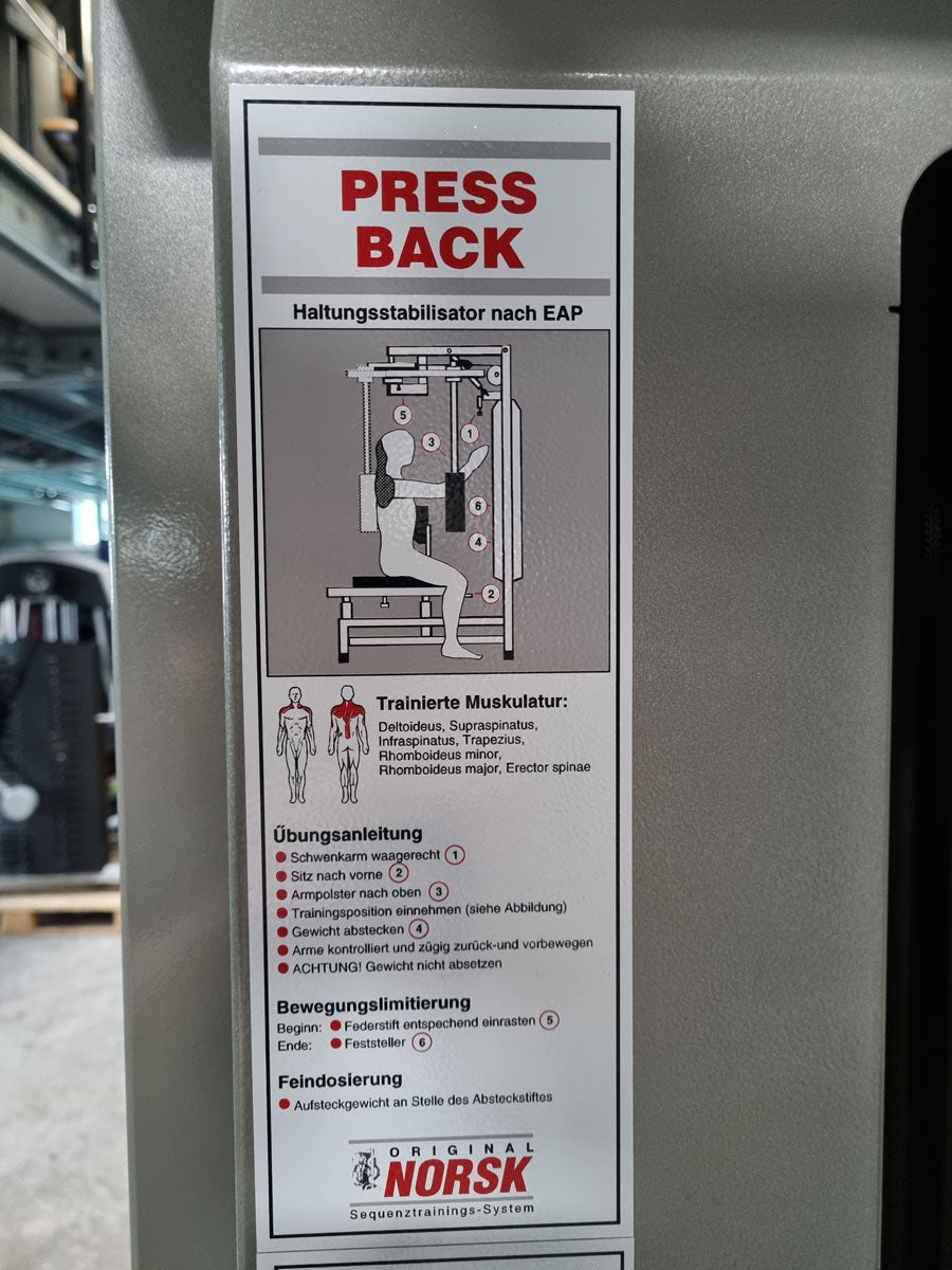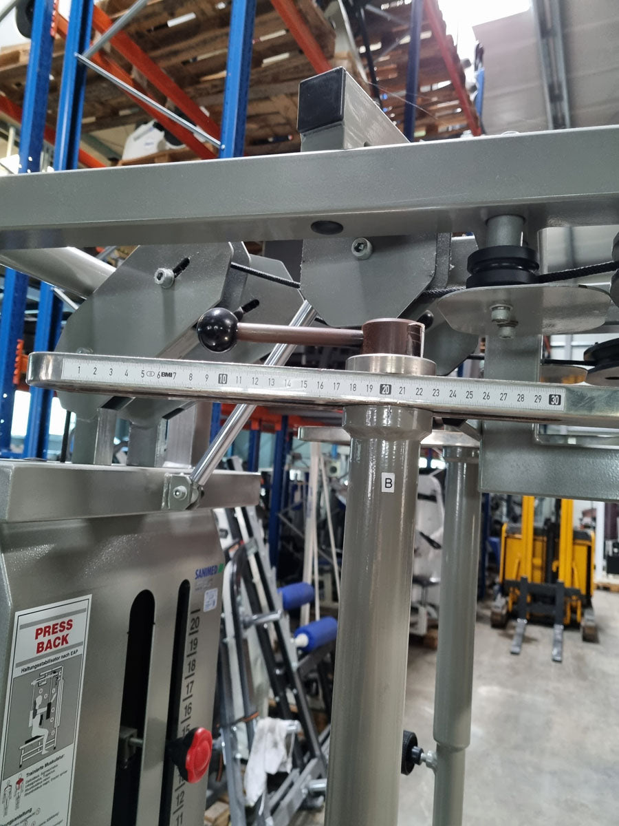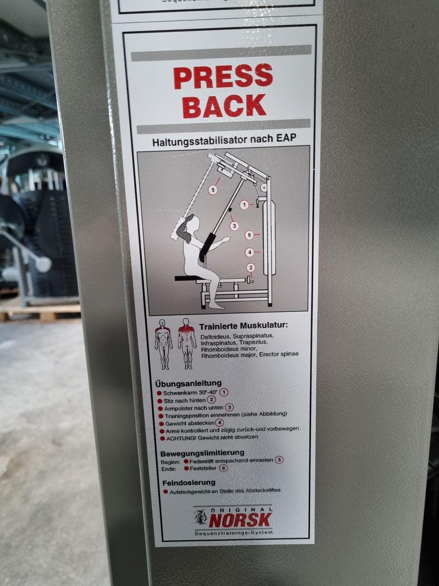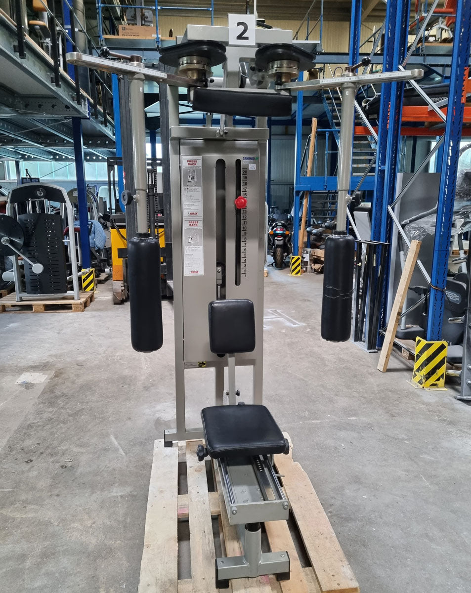 Mit diesem Butterfly Kombi Reverse Kraftgerät von Norsk Sanimed trainieren Sie effektiv aber auch schonend die oberen und seitlichen Rückenmuskeln und teile der Schultermuskulatur sowie die Brustmuskulatur. Die offizielle Herstellerbezeichnung von dieser Butterfly Kombi Kraftmaschine lautet Haltungs und Bruststabilisator. Das Gerät bietet eine vielzahl von Einstellungsmöglichkeiten um die Maschine perfekt auf Sie auszurichten. Die Machine ist mit einem Gewichtsbock mit 14 Gewichtsplatten ausgestattet. Die Sitz lässt sich hydraulisch in 11 Stufen in der Höhe und in mehreren Stufen vor und zurück verstellen um das Gerät an jede Körpergröße anzupassen. Das Brust-Rückenpolster lässt sich in der Neigung in 7 Stufen verstellen und die Arme können in 30cm länge genau auf die Armlänge der trainierenden Person für die optimale Griffposition angepasst werden. Sitzt man mit der Brust am Polster kann die Butterfly Reverse Übung für die Rückenmuskulatur ausgeführt werden, sitzt man mit dem Rücken am Polster kann die normale Butterfly Übung für die Brustmuskulatur trainiert werden. Die Schultermuskulatur arbeitet bei beiden Übungen mit. Außerdem verfügt das Gerät über einen Bewegungsbegrenzer der ganz einfach verstellt werden kann.