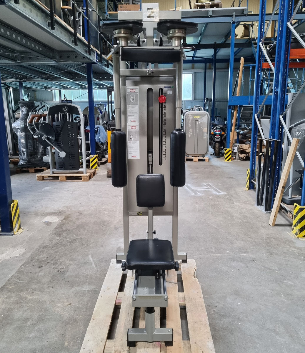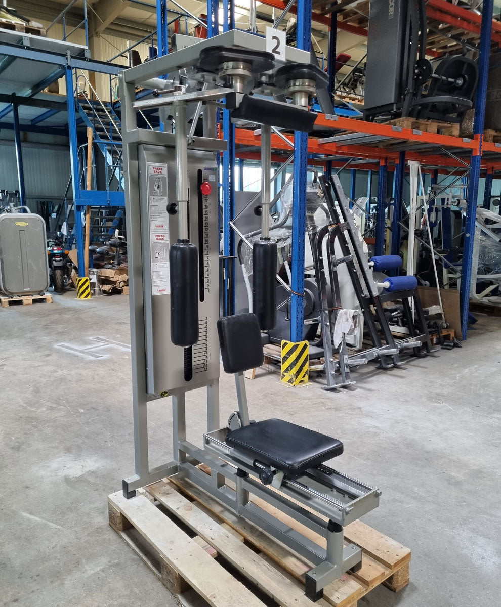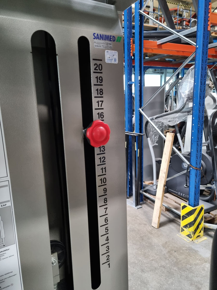 Mit diesem Butterfly Kombi Reverse Kraftgerät von Norsk Sanimed trainieren Sie effektiv aber auch schonend die oberen und seitlichen Rückenmuskeln und teile der Schultermuskulatur sowie die Brustmuskulatur. Die offizielle Herstellerbezeichnung von dieser Butterfly Kombi Kraftmaschine lautet Haltungs und Bruststabilisator. Das Gerät bietet eine vielzahl von Einstellungsmöglichkeiten um die Maschine perfekt auf Sie auszurichten. Die Machine ist mit einem Gewichtsbock mit 14 Gewichtsplatten ausgestattet. Die Sitz lässt sich hydraulisch in 11 Stufen in der Höhe und in mehreren Stufen vor und zurück verstellen um das Gerät an jede Körpergröße anzupassen. Das Brust-Rückenpolster lässt sich in der Neigung in 7 Stufen verstellen und die Arme können in 30cm länge genau auf die Armlänge der trainierenden Person für die optimale Griffposition angepasst werden. Sitzt man mit der Brust am Polster kann die Butterfly Reverse Übung für die Rückenmuskulatur ausgeführt werden, sitzt man mit dem Rücken am Polster kann die normale Butterfly Übung für die Brustmuskulatur trainiert werden. Die Schultermuskulatur arbeitet bei beiden Übungen mit. Außerdem verfügt das Gerät über einen Bewegungsbegrenzer der ganz einfach verstellt werden kann.