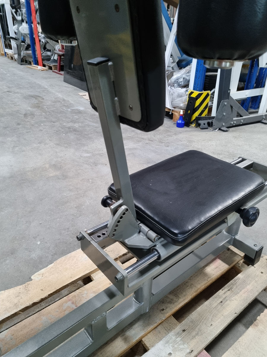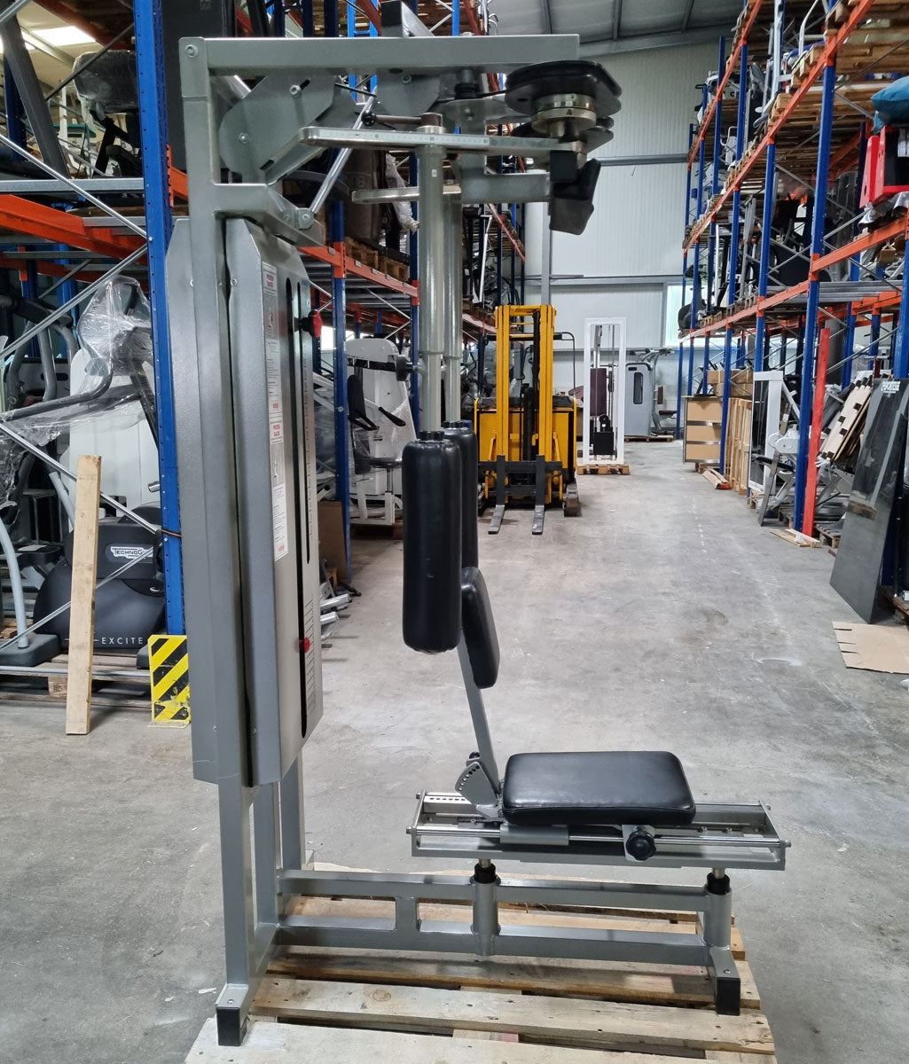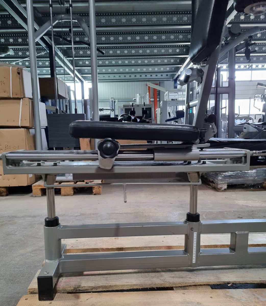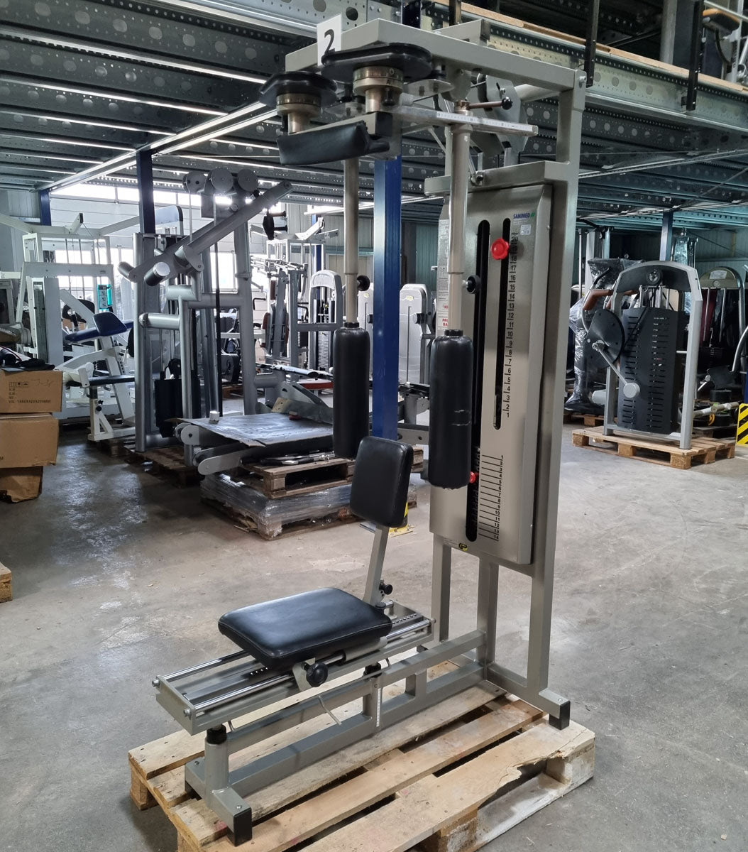 Mit diesem Butterfly Kombi Reverse Kraftgerät von Norsk Sanimed trainieren Sie effektiv aber auch schonend die oberen und seitlichen Rückenmuskeln und teile der Schultermuskulatur sowie die Brustmuskulatur. Die offizielle Herstellerbezeichnung von dieser Butterfly Kombi Kraftmaschine lautet Haltungs und Bruststabilisator. Das Gerät bietet eine vielzahl von Einstellungsmöglichkeiten um die Maschine perfekt auf Sie auszurichten. Die Machine ist mit einem Gewichtsbock mit 14 Gewichtsplatten ausgestattet. Die Sitz lässt sich hydraulisch in 11 Stufen in der Höhe und in mehreren Stufen vor und zurück verstellen um das Gerät an jede Körpergröße anzupassen. Das Brust-Rückenpolster lässt sich in der Neigung in 7 Stufen verstellen und die Arme können in 30cm länge genau auf die Armlänge der trainierenden Person für die optimale Griffposition angepasst werden. Sitzt man mit der Brust am Polster kann die Butterfly Reverse Übung für die Rückenmuskulatur ausgeführt werden, sitzt man mit dem Rücken am Polster kann die normale Butterfly Übung für die Brustmuskulatur trainiert werden. Die Schultermuskulatur arbeitet bei beiden Übungen mit. Außerdem verfügt das Gerät über einen Bewegungsbegrenzer der ganz einfach verstellt werden kann.