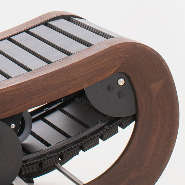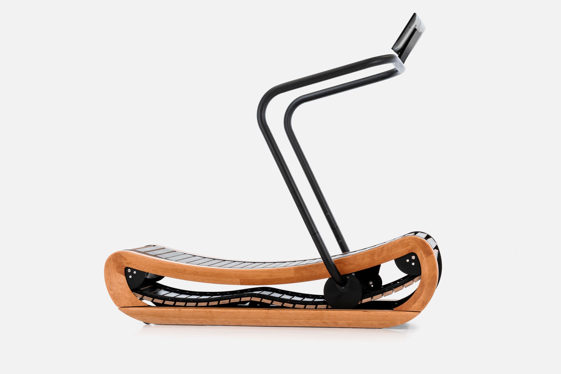 Geschwungenes, leichtes Design mit edlem Holzrahmen und Lamellenflauffläche. Die gekurvte Lauffläche fördert die Mittel- und Vorderfußlauftechnik.