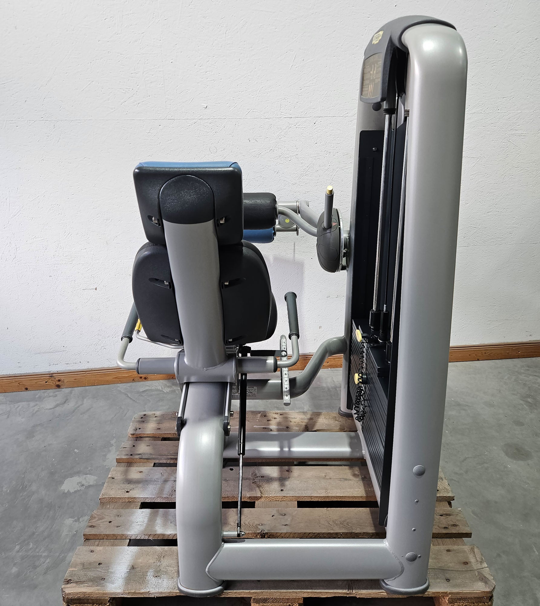 Leg extension seated: hier lässt sich der Sitzschlitten in 9 Stufen in der Länge nach vorne oder hinten verstellen. Ebenso lässt sich die Beinpolsterrolle im Winkel in 5 Stufen einstellen, so dass das Fitnessgerät individuell auf den Benutzer eingestellt werden kann. Der Beinstrecker ist mit einem extra großen 125kg Gewichtsblock in 5kg Stufen und einem Feingewicht in 2,5kg Stufen zur kleinen Steigerung ausgestattet.
