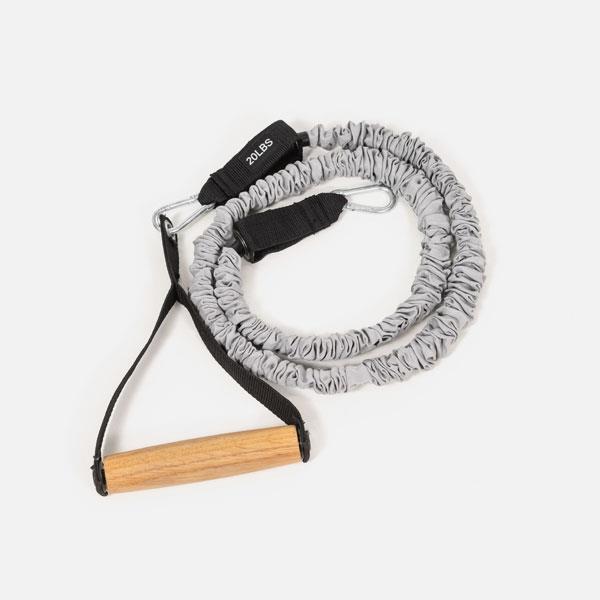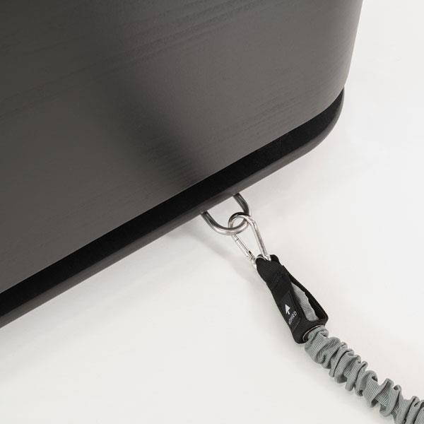 - Die vier Widerstandsbänder in verschiedenen Spannungen (10, 20, 40 und 50) werden platzsparend unter den gepolsterten Deckeln aufbewahrt. Mit Hilfe von Karabinern werden diese unten an der StepBox an ausziehbaren Haken befestigt und in Kombination mit den kugelgelagerten Griffen für verschiedene Übungen verwendet.