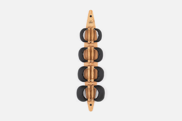 Griffe aus edlem Holz, umhüllt von handgenähtem Echtleder - acht Swing Hanteln (2er Set: 2, 4, 6, 8 kg) werden platzsparend am Swing Board aufbewahrt.