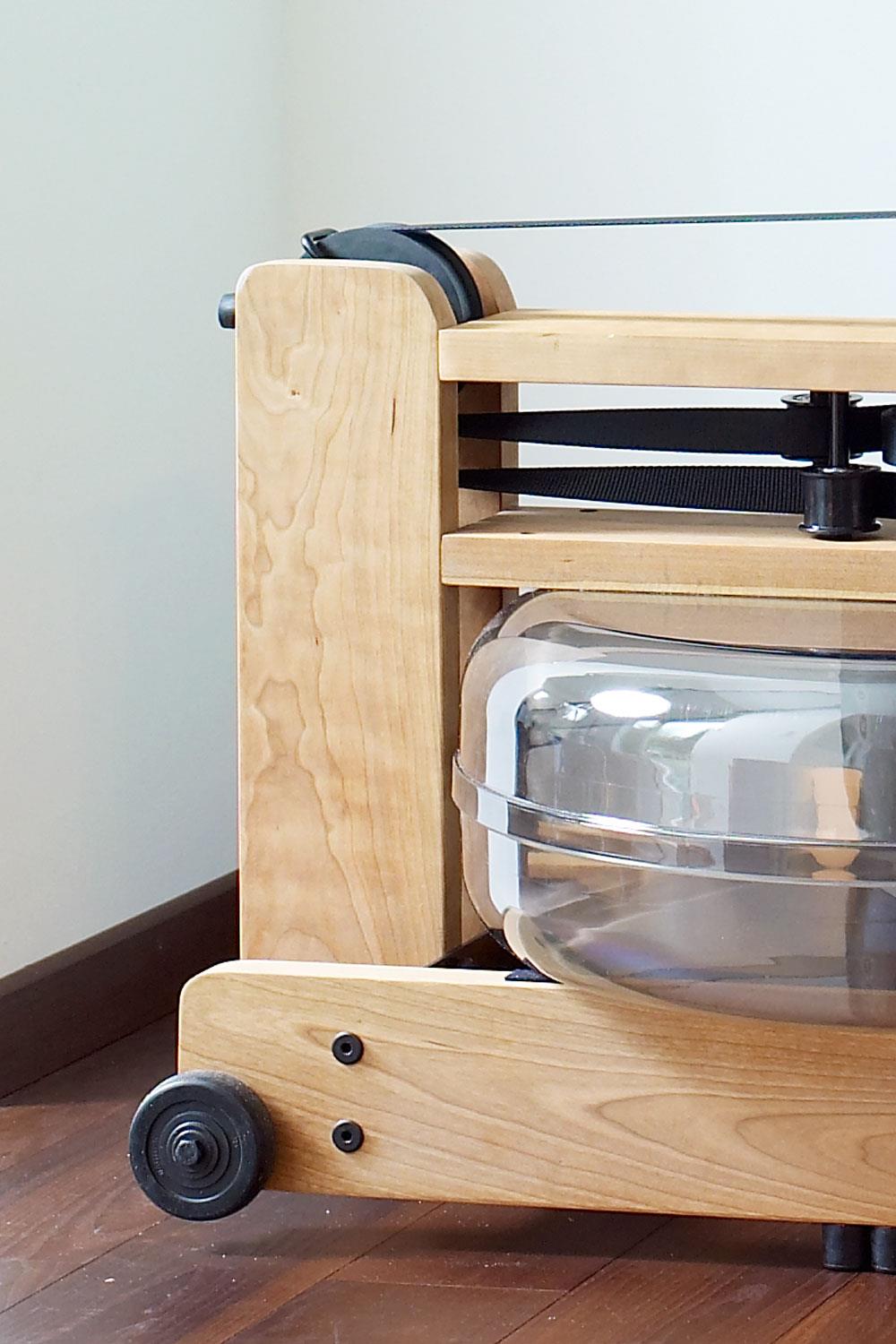 Das Rudergerät lässt sich nach dem Training platzsparend verstauen: Mit einem einfachen Handgriff kann das Rudergerät hochkant an der Wand platziert werden, das Wasser bleibt dabei sicher im Tank.